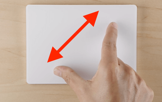 다음은 두 손가락을 활용한 제스처입니다. 맥의 제스처와 역시 동일합니다. 두 손가락을 위로 올리면 아래로 스크롤 되며, 두 손가락을 아래로 내리면 위로 스크롤됩니다. 이는 아이폰의 스크롤 방식과 동일합니다. 하지만 반대 방향으로 하시고 싶다면 위에서 언급한 설정 메뉴에서 자연스러운 스크롤을 체크 해제해 주세요. 그러면 손가락 방향을 따라서 스크롤됩니다. 그리고 아이폰에서 하는 것처럼 두 손가락을 이용하여 핀치 줌을 지원합니다. 확대를 지원하는 화면에서 두 손가락을 올려놓고 손가락을 벌리면 확대되며, 좁히면 축소됩니다.