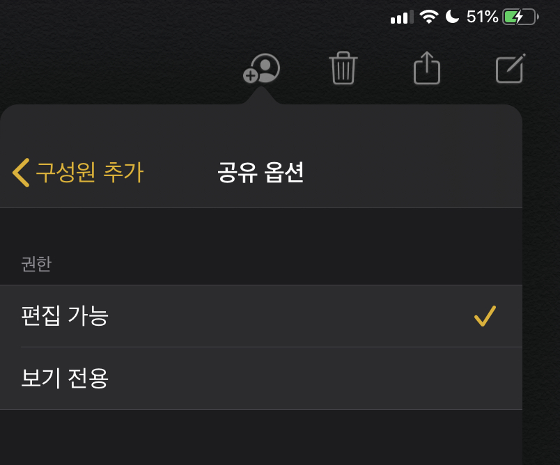 메모를 개인적으로만 볼 수 있지만 여러 사람이 공동으로 편집하고 확인할 수 있도록 할 수 있습니다. 예를 들어 저는 아내와 함께 집에 있는 식재료를 공유합니다. 서로 따로 먹더라도 이미 먹은 식재료는 지우고 상대도 확인이 가능하기 때문에 불필요한 식재료 구입을 막을 수 있죠.