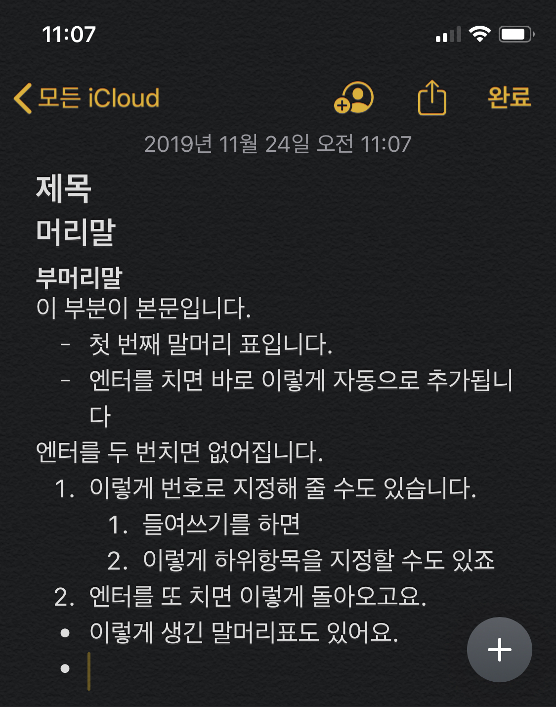 한번 저기에 있는 기능들을 써서 메모를 해 본 것입니다. 제목이 제일 굵고 크며, 그 다음이 머리말, 부 머리말, 본문 순입니다. 그리고 "-, 번호, ." 등의 말머리 표를 입력하는 것이 가능합니다. 그리고 들여 쓰기 버튼을 누르면 저렇게 하위 항목으로 추가해 줄 수도 있습니다. 말머리 표를 이어나가다가 그만 넣고 싶으면 엔터 버튼을 한 번 더 눌러주시면 없어지거나 이전 말머리 표로 돌아가게 됩니다. 그냥 적는 것보단 훨씬 잘 정리된 메모를 만들 수 있겠죠?