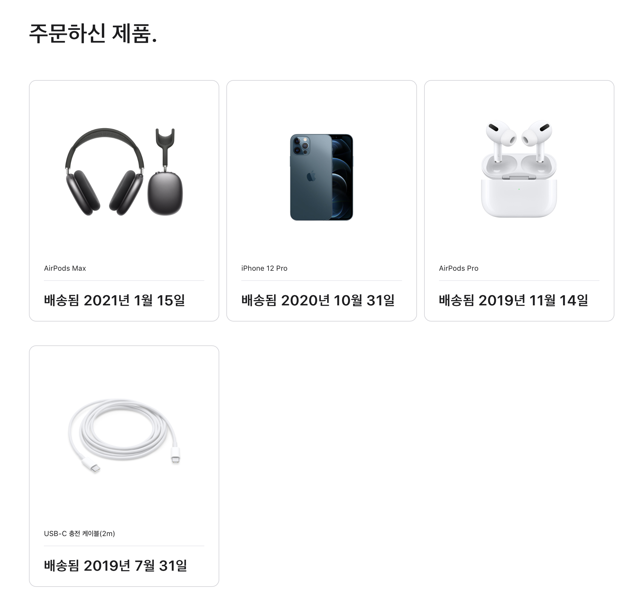 그러면 자신이 주문했던 애플 제품들이 보이게 되는데요. 우선 저는 제가 구입한 에어팟 맥스로 환불하는 방법을 연습해보도록 하겠습니다. 환불할 제품을 눌러주세요.