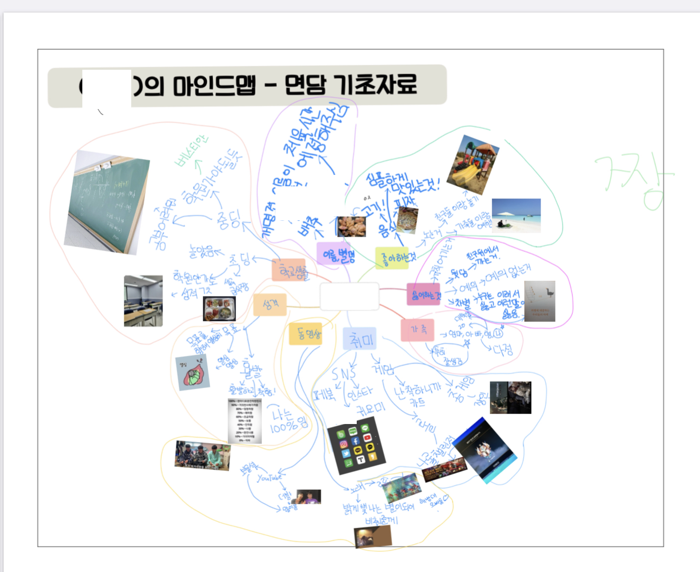 이 파일 역시 모둠으로 제공됩니다. 모둠으로 각 탭에 학생들이 자신을 인터뷰할 친구를 위해 사전 정보를 제공하는 파일입니다. 자신을 나타낼 수 있는 모든 정보들을 마인드맵으로 만들어 두면 이 친구를 인터뷰할 친구가 이 탭을 자신의 학습지에 가져가 이를 바탕으로 질문을 만드는 것입니다. 참고로 이 마인드맵에 질문하지 않았으면 하는 것은 따로 적어두어 인터뷰어가 참고할 수 있게 합니다. 학생들이 가장 많이 적는 게 자기 몸무게 물어보지 말아달라는 것이더라고요.ㅋㅋ