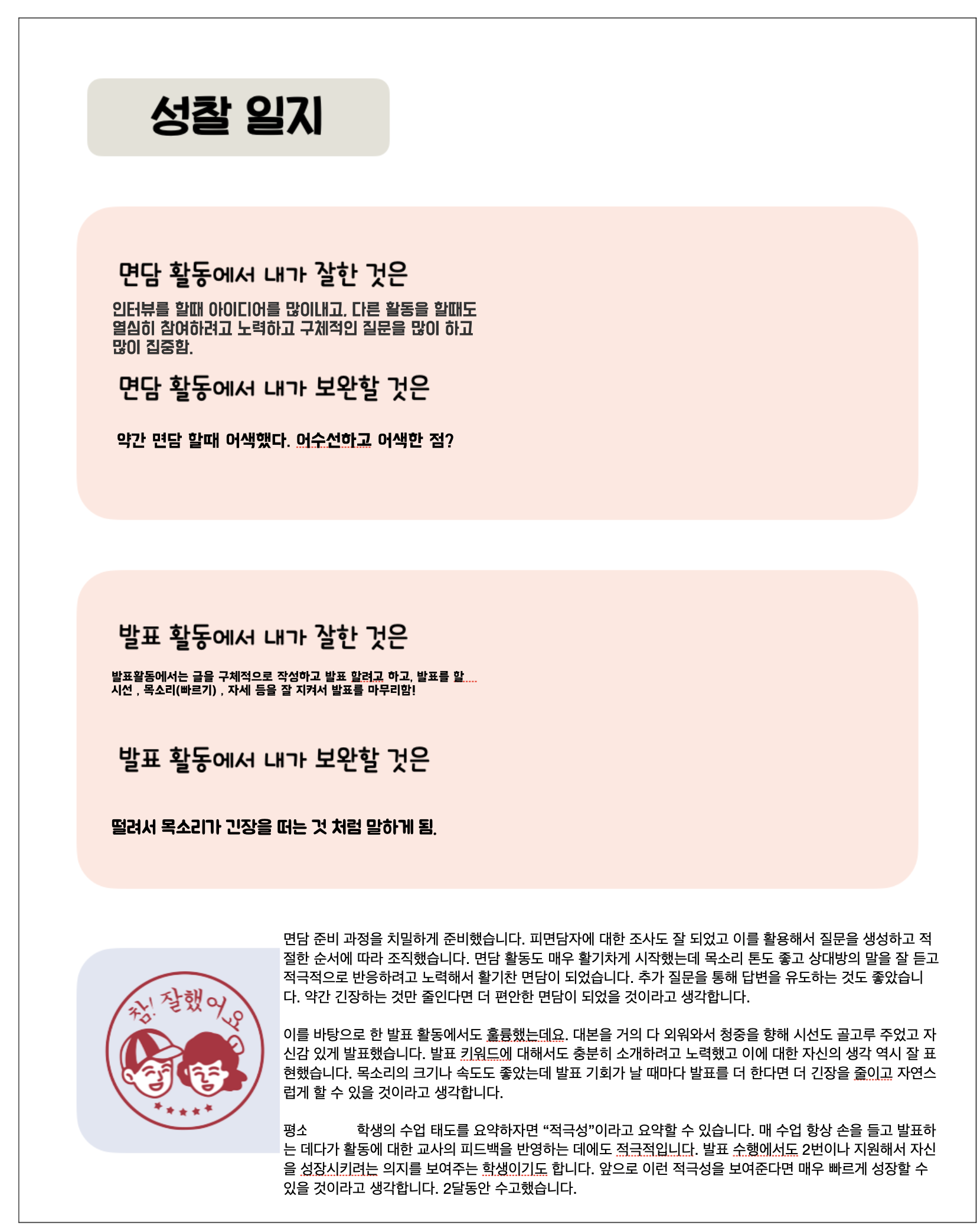 발표하면서 잘 몰랐던 친구에 대해 알게 되기도 하고 발표를 하면서 발표 스킬도 익히고 발표 경험을 쌓게 하는 것입니다. 여기까지 진행되면 자기 평가를 실시합니다.