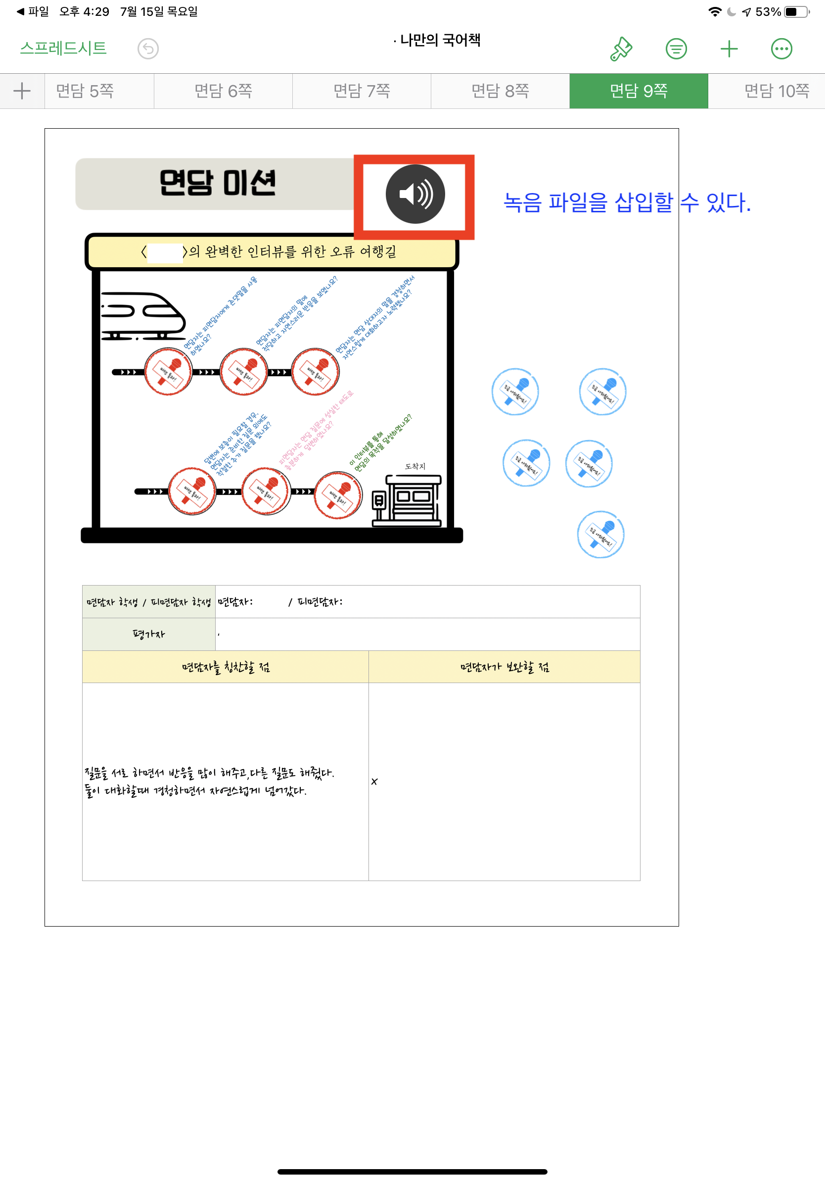 아이패드 면담이 좋은 것은 면담 내용을 기록하고 친구들의 피드백을 받기 좋다는 것입니다. 이를 위해 면담 활동 넘버스도 모둠 파일로 제공됩니다.